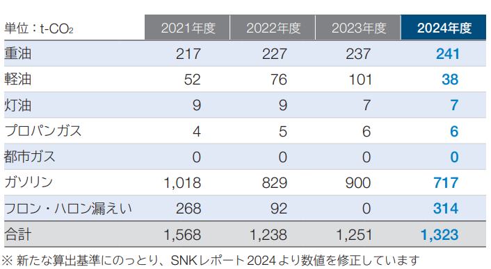 2024 年度連結の Scope1 は、1,323(t-CO2)となりました。2024年度は、車種クラスごとに燃費を算出し精度の高い燃料使用量の算出方法に変更し、エコカーの導入効果は認められたものの、2023年度より72(t-CO2)増加しました。排出量の大半は社有車、通勤用私有車によるガソリン消費量であることから、水素燃料電池車などエコカーの導入をさらに進めています。