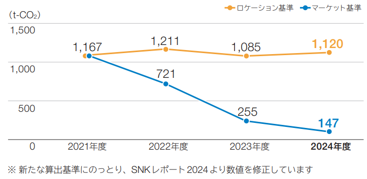 22022年度から、排出量の算定方法を従来のロケーション基準からより精度の高いマーケット基準に見直し、管理対象に拠点現場を新たに加えました。2024年度連結のScope2は、マーケット基準では147(t-CO2)でした。従来のロケーション基準でのScope2は1,120(t-CO2)となり、2023年度より35(t-CO2)増加しました。今後も引き続き自社施設における電気使用量の低減に向け、取り組んでいきます。