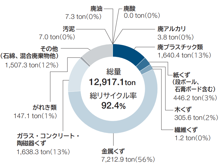 2024年度の産業廃棄物の総排出量は12,917.1(ton)、リサイクル率は92.4%でした。総排出量は2023年度より6,809(ton)減少、リサイクル率はほぼ同等でした。種類別にみると、排出量が金属くずと木くずで全体の約58%を占めており、リサイクル率はそれぞれ、99.8%、98%となっています。今後も引き続き、リサイクル率の低い廃棄物を有効に回収する方法や排出量を減らす工夫など、地球環境問題の解決に向けて取り組んでいきます。