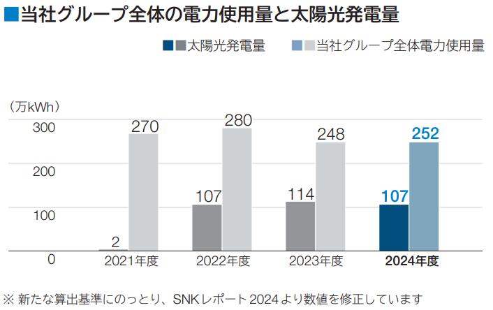 当社のグループ会社である日宝工業株式会社にて太陽光発電所を取得し、2022年度から売電事業を開始しました。本発電所は福島県田村市にあり発電出力は約850kWです。2024年度の年間発電電力量の実績は約107万kWhで、2023年度より7万kWh減少しました。本太陽光発電所での発電量は当社グル-プ全体で2024年度に消費した電力量の約43%に相当します。発電した全ての電力は、再生可能エネルギー電気の利用の促進に関する特別措置法の固定価格買取制度を適用しています。この再生可能エネルギーの売電は、当社グループの温室効果ガス排出量削減量には含めていません。今後、太陽光発電に限らず、さまざまな手段を通じて再生可能エネルギーの導入を推進することで、気候変動問題に貢献しています。
