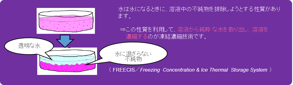 この技術は水が凍るときに【不純物を排除して純粋な水だけで凍る】という性質を利用したもので、製氷コイル表面に排水を滴化させゆっくりと氷を成長させると、排水中の不純物が排除され純粋な水だけが氷となります。残った排水は原水と比べて1/10まで濃縮・減容化されます。